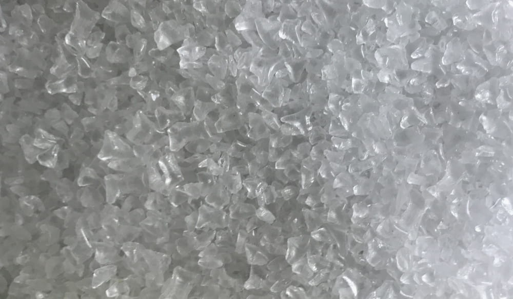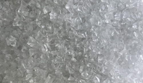 Granulat szklany o zaokrąglonych krawędziach, przeznaczony do zdobienia ceramiki.